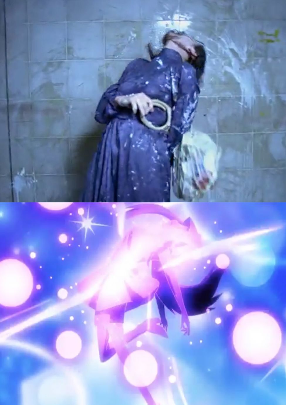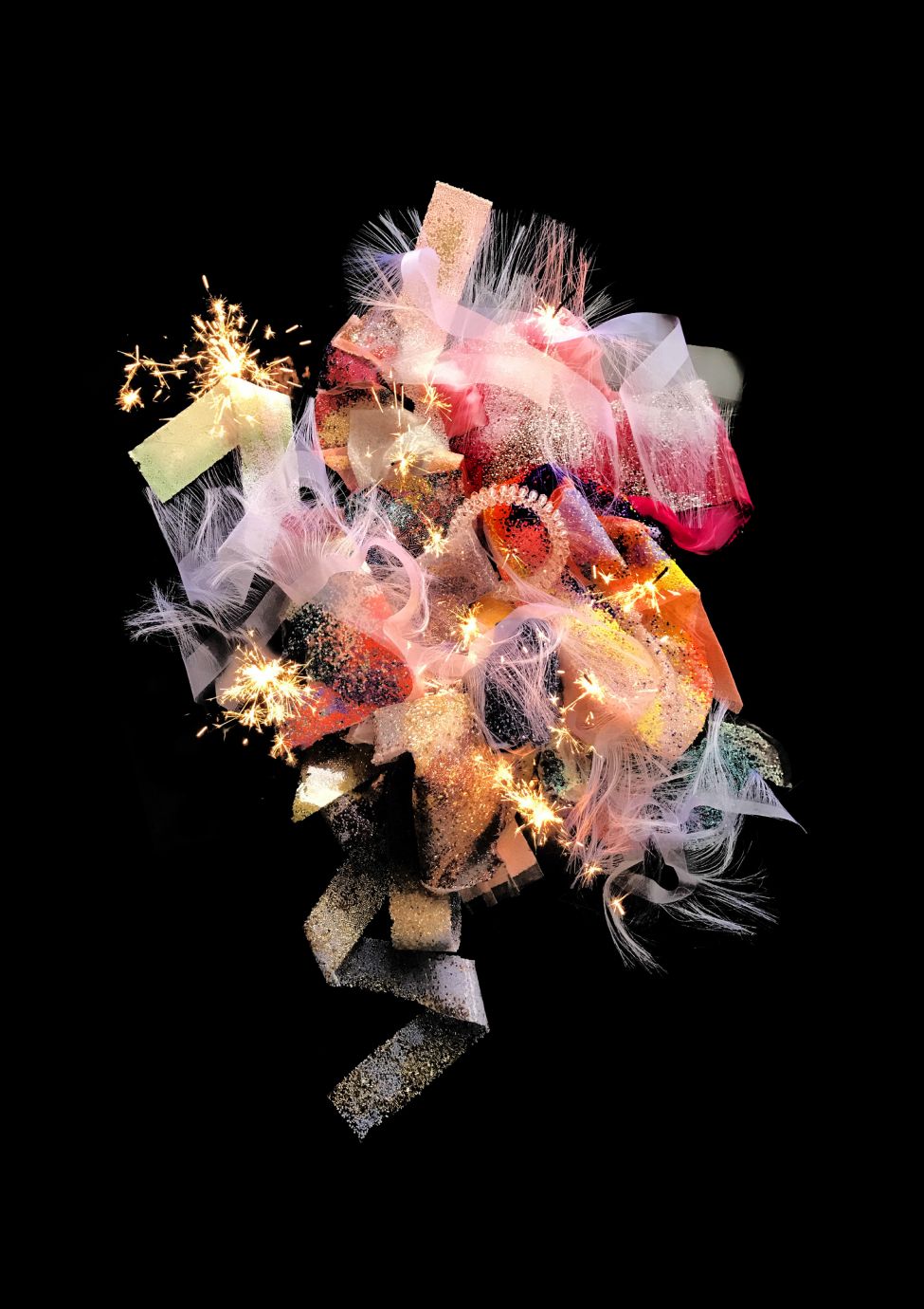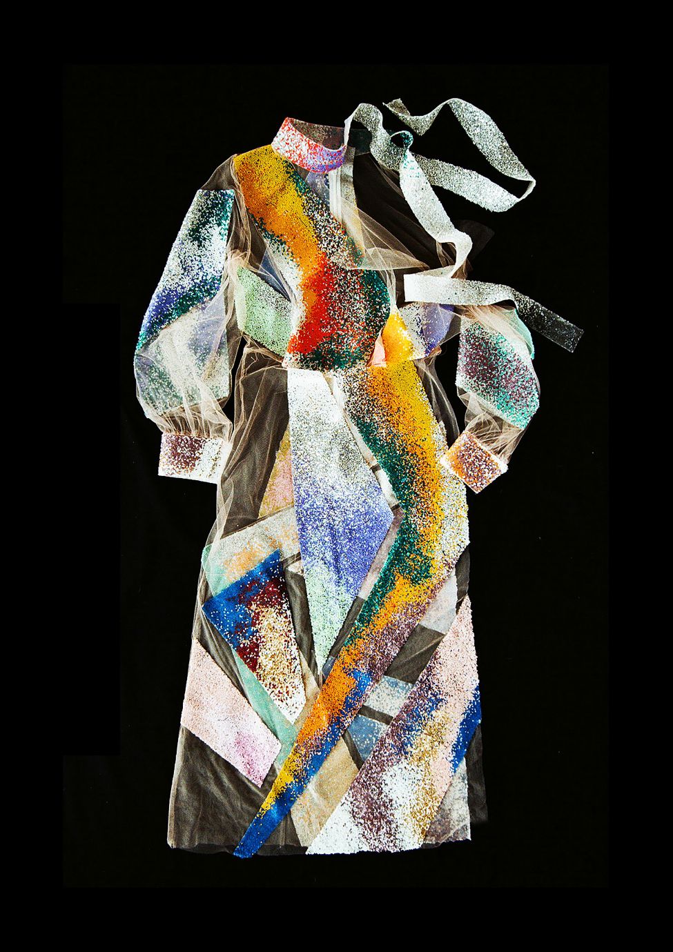 - textile is driping from the garment like the character is drowning in sparkles
