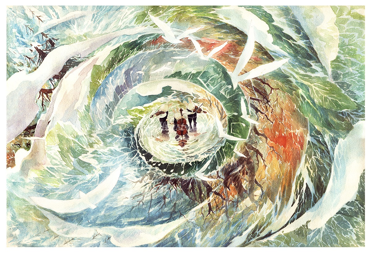 - Introduction of surrealist characters to represent detachement - working on scale and page composition - the sky as a character in the paintings setting of the narrative, a directive line to the story. - The idea of time melting, my story is poetical and metaphoriacal, not set within a time frame.