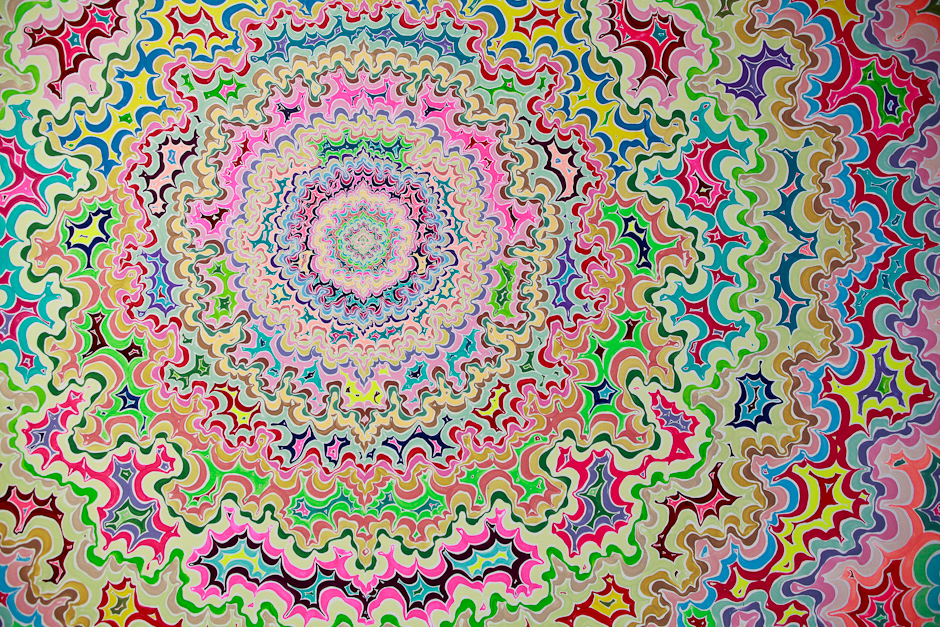Brookes masterfully melds a deep knowledge of cognitive science and art to create bright, intensely detailed paintings that abstract drug compounds, molecules, atoms and hallucinogenic states to heighten a viewer’s sensory perceptions and reactions. His two main bodies of work — molecules and aesthetic abstractions — are created with a rigorous process of attentiveness. A process of focusing awareness on the paint that is lost from the brush as it is applied to the surface of the canvas, then refocusing attention as the mind wanders away; which provides visual evidence of both an artistic process and meditation in practice. Brookes’ molecular paintings begin as two-dimensional maps of the precise locations of individual atoms, molecular line drawings, which then expand and radiate out from these hyper detailed locations/focal points to cover the entire canvas surface. The result, but never the end result, is a colorful abstract representation of the subject molecule. Often, Brookes’ aesthetic abstractions are meticulously painted surfaces that are organically constructed or stretched to provide an overt aesthetic connection to Eastern contemplative traditions, such as Buddhism.