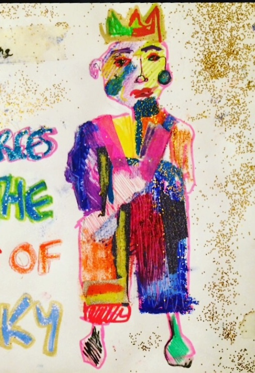 The faces are alway very important in my work as it shows the true feelings of the caracthers/ the under lying story behind the profusion of colours, here the little kings shows an expression of profound turmoil and delusion. he does not know whats happennig but he is scared.