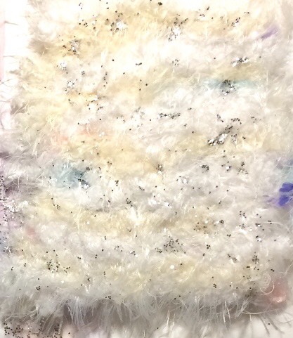 I also used pastel/rainbow lurex and silver fringe yarn to show the idea of the moutain landscape being oneiric enligthened by the light of the sunset. I mainly used white, pale pink, pale purple, pale blue and silver because i feel like those are the colours i used the most in my illustrations to portray innocence.