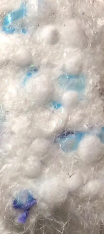 However because its layered up in the weaving samples it gives up a turquoise blue colour wich was not the attended purpouse of the yarn Although i liked the tone because it looked like the colour of ice it did not bring the wanted effect. I liked using white "fur" balls to immitate the spirals in the wool. it brought back some texture to the samples.