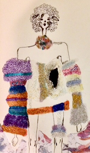 Sketchbook comments : I processed to fill up the negative space on the blacked out mothers with colours and sparkles gluing sequins on all of the surface to iniate the idea of innocence and transformation being juxtaposed.