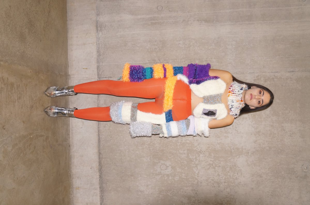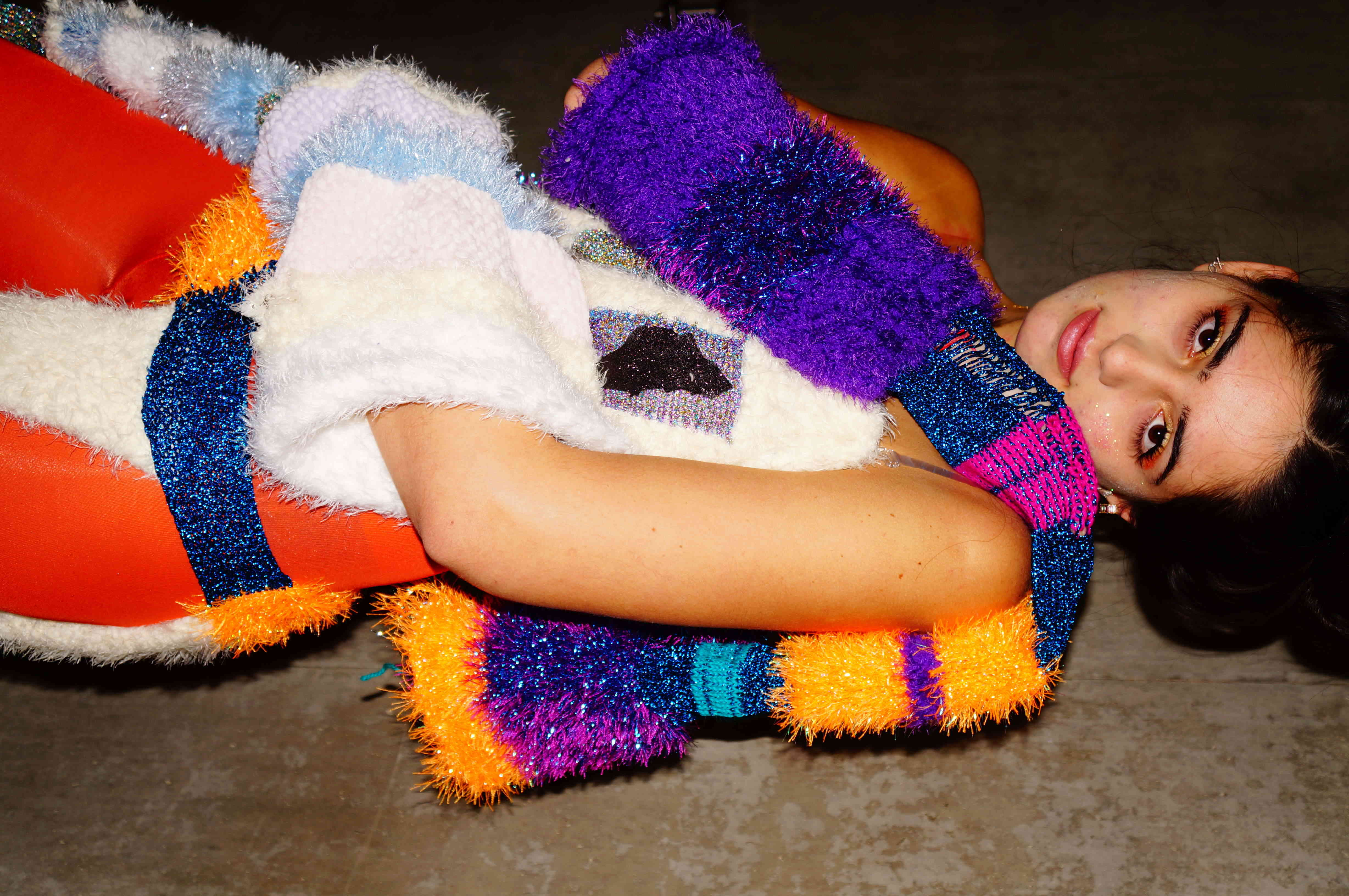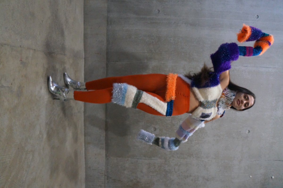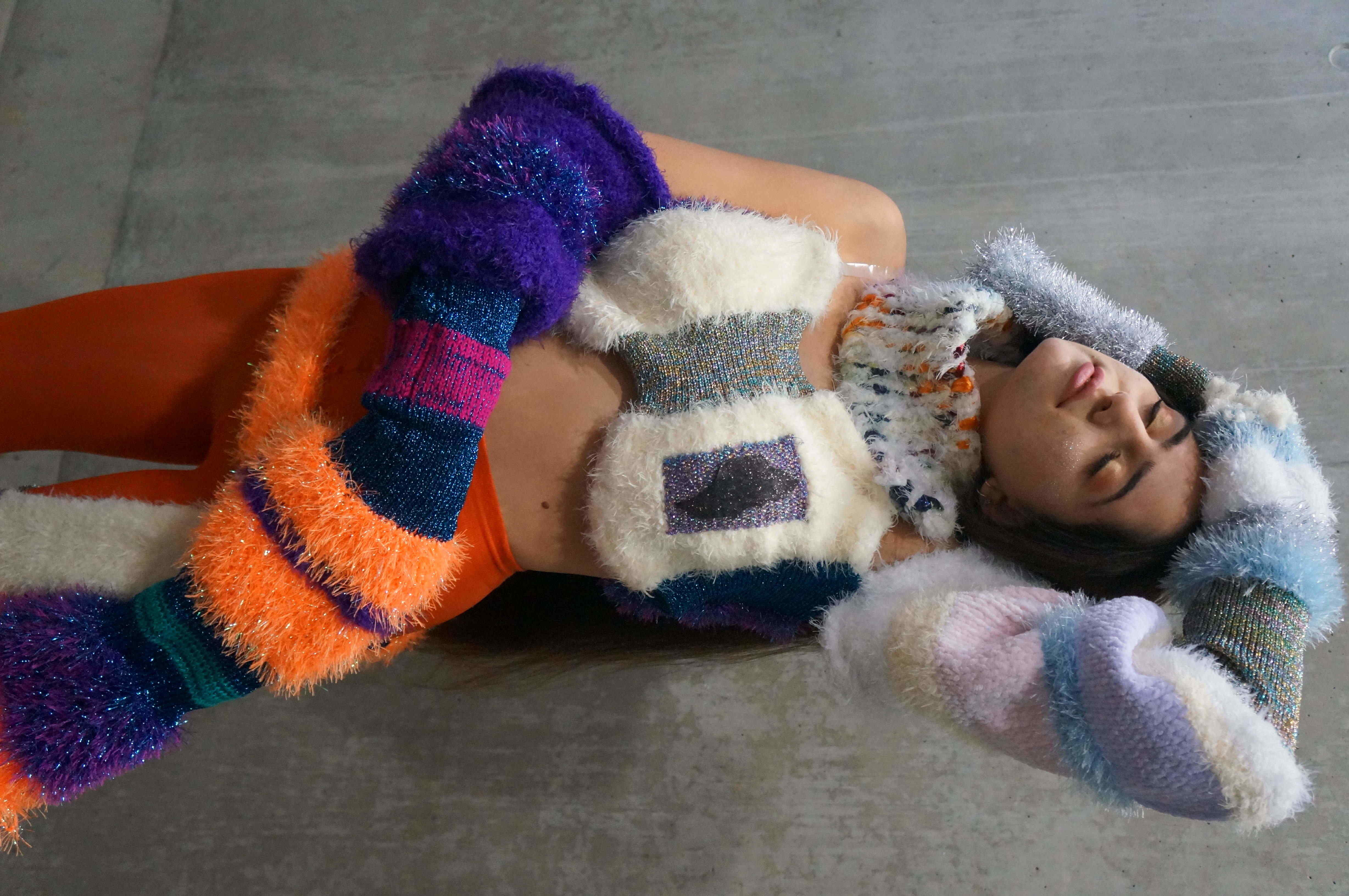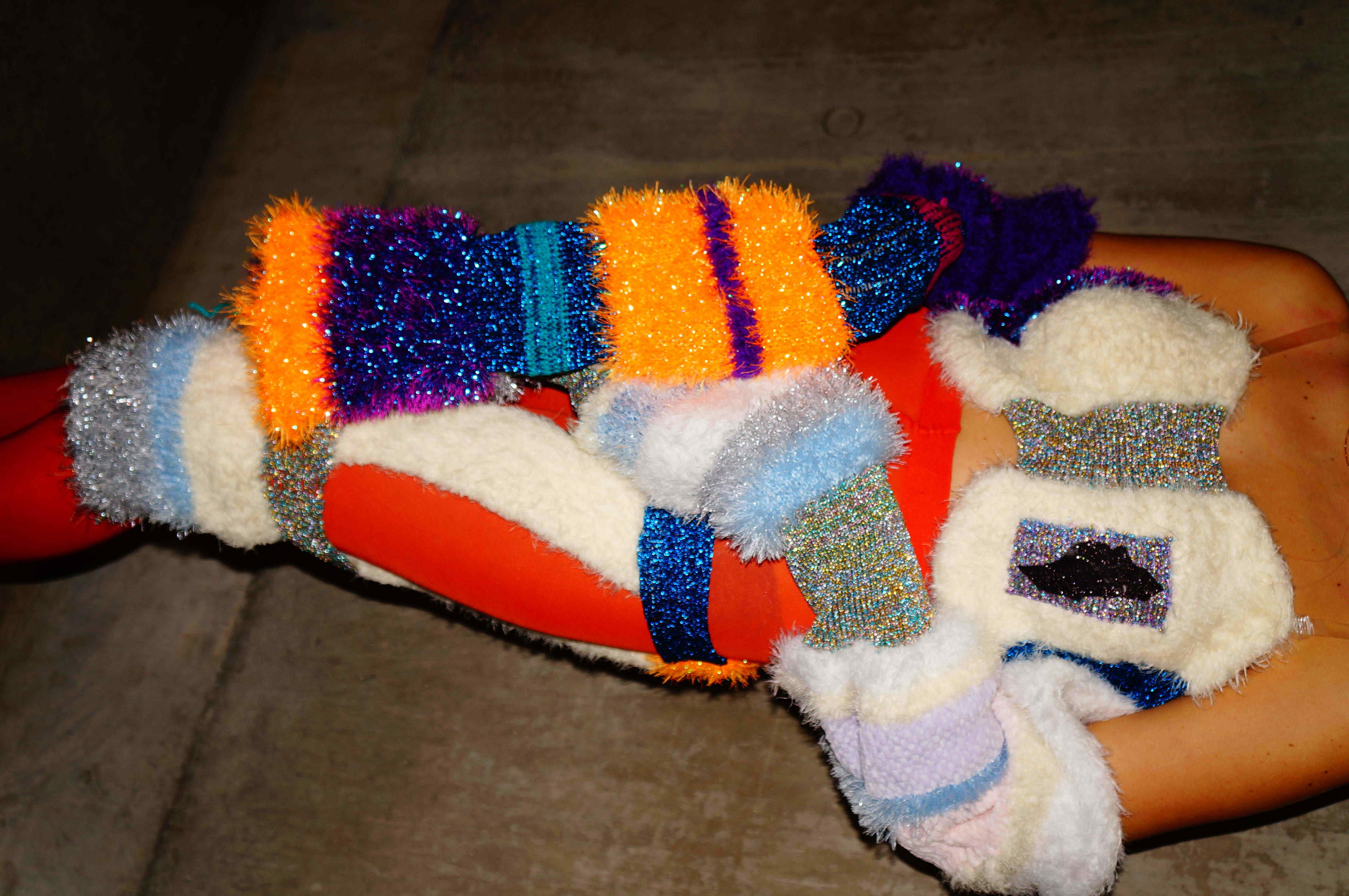 The garment will mainly consist of an extension from my already existing samples representing both the softness of the sheep wool with fluffy yarn and the overwhelmingness of sparkles expresssed by different yarns reminescent glimer profusion as well as lurex.