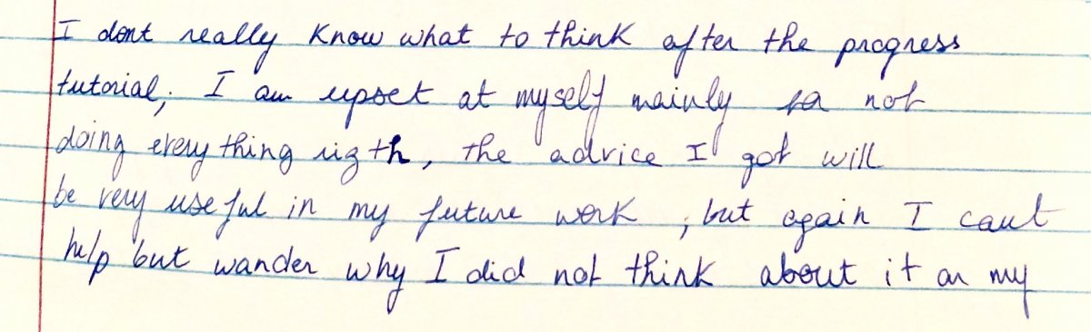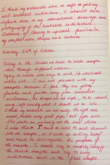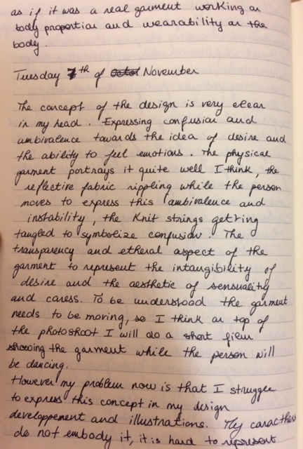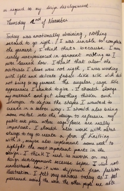 2) How could your written reflection feed back into and strenghten your research process ? written reflection is a way to pause the research process. Look back on the day and explain what you did regarding your work and why, what effect/techniques you liked/did'nt like and why, where is your project developpement going and why. It also make you look at your work critically and brings out the key points of interest and allows to set a direction for future researches or design developpement. Moreover, it is important to document your work to go back to it and explain to others your idea in the best way possible.