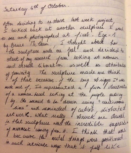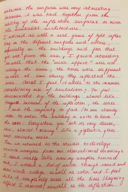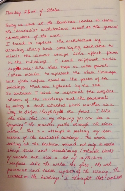 Today we did observational drawings at King Cross, I enjoyed it because when i draw I feel resolutely insouciant, very absorbed and driven by the profusion of the lines, colours and patterns on the page. Uncomonly unanxious if things did not look perfect, absolutely transended with expressing my reactions to what I noticed, instinctively.