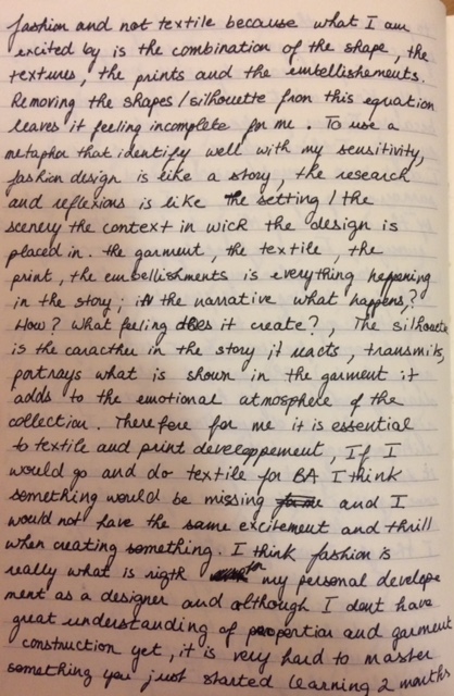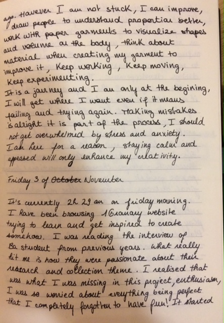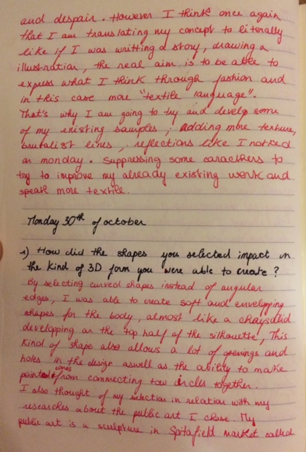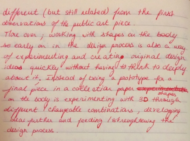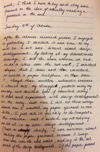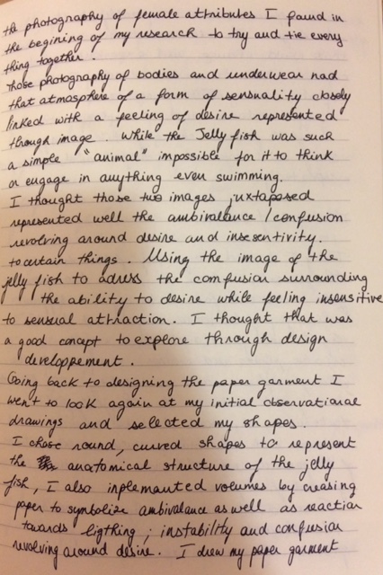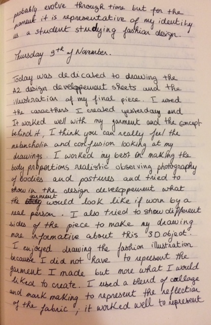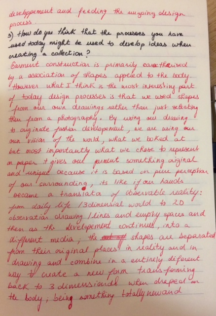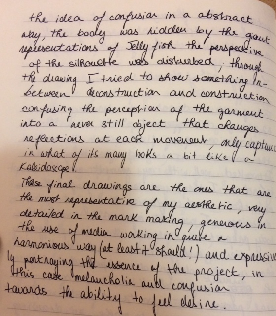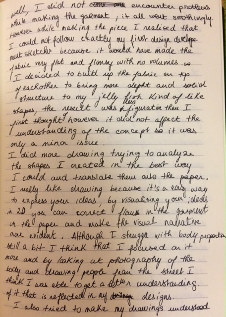2) How do you plan to use these in future work ? I will think more about developing ideas using volumes as well as drawing and reflect on how the shapes of the garnement and the patterns would work together. I am also going to try and be more care free when drawing and developing ideas, because original concept does not always comes out of something smooth and still, a drawing can also we loud and imperfect because it could initiate new ways of working, sometimes happenstance is better than controlled, it can be more creative. I am also going to use mark making and continuous lines to draw in project development because I feel it works well for me.