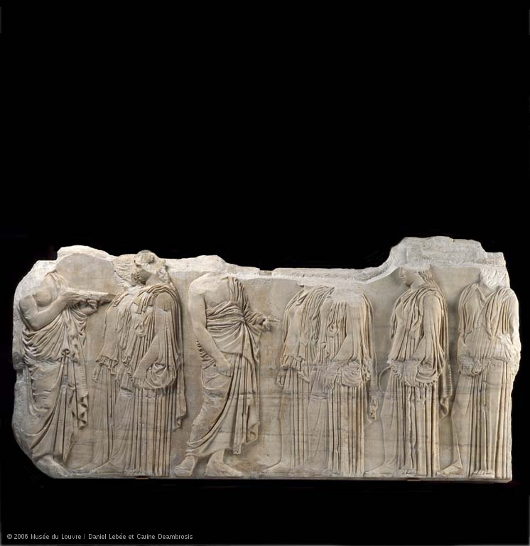 Plaque dite des Ergastines : fragment de la frise est du Parthénon Entre 445 et 438 avant J.-C. Trouvée au pied du Parthénon, sur l'Acropole d'Athènes.