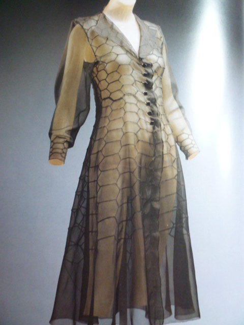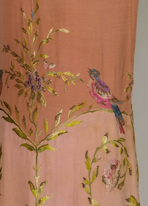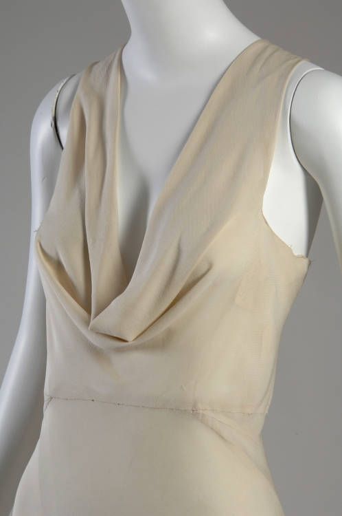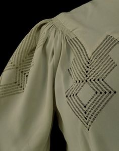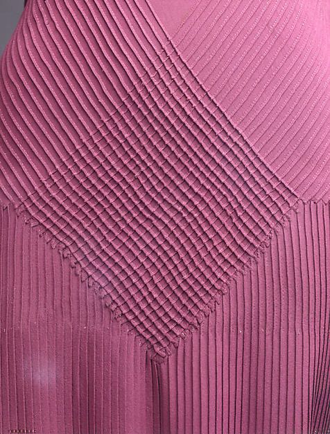 Madeleine Vionnet uses Lingerie techniques like Crimping: compress fabric into small folds or ridges or Fagoting : an embroidery produced by pulling out horizontal threads from a fabric and tying the remaining cross threads into groups of an hourglass shape.