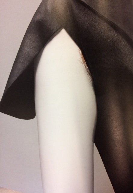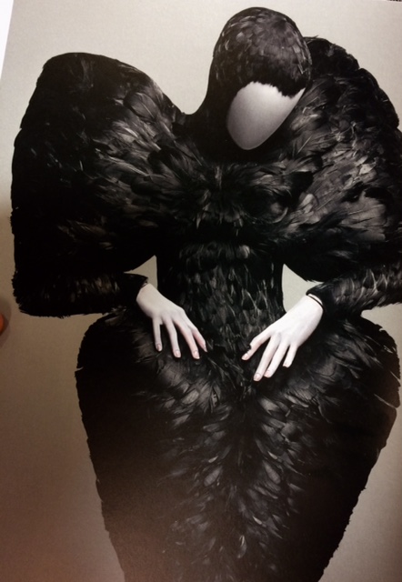 The garnement changes the shape of the silhouette, to change the perception of the person. Design can be looked in relation with how a person is viewed in society. The shapes of the clothes can hide or reveal, it changes the point of focuse in the body. The large garnement seems to almost eat the body, swallowing the figure. The woman is metamorphosed into a bird almost literally, even her head is covered in feathers. The garnement is almost like a costume, it changes the body and almost the mind of the person inside like if they where not themselves anymore. I feel like it is a representation of a metamorphosis between life and death. The design relation to the body informs the message behind it. Rather than being only conceptual I have to think about how without having to explain it with words ; My ideas can shine through my designs using the textures, the shapes, the patterns to inform the concept. Also I like the idea of clothing being overwhelming like if you were not your self inside it.