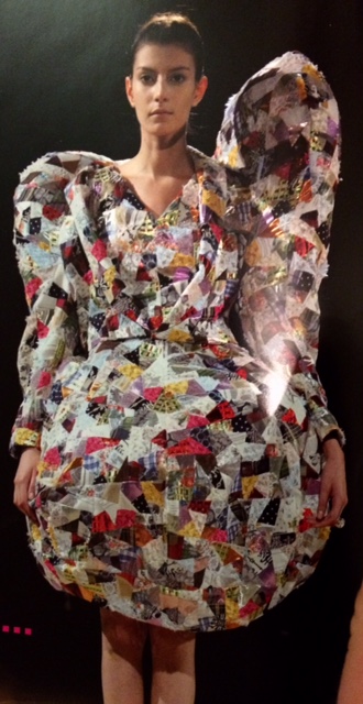 What I like in this design is how shapes were maximise, almost like creating a sculpture that exclude the human body from the piece; Using prints in this repetitive way of juxtaposed triangle almost excluded the silhouette. No part is more important in the garnement. Its stable and seems almost totally independant. It makes me think about collage and interior design print; like an object showcased on the body. I feel the designer wanted to exclude the silhouette from the design and create an almost independant structure. It is disturbing in a way, it creates a completely new shape for the body without being in adequacy with it. I could use the idea of creatting a unsettling garnement for the body; ignoring the silhouette when draping for example to make something entirely of its own. The paradoxal approach to design could be interesting to express a feeling of disturbance, of "not fitting" in the world.