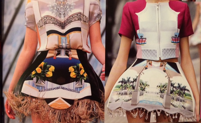 In Mary Katranzou designs the print becomes like a optical illusion, through the colours and the patterns representing a photography. The silhouette is forgotten; the prints shine through, the focuse is not done on the body but what it could become; the vehicule of the print in a harmonious way. The patterns can either conform to the shape of the body or exclude the body from the design.